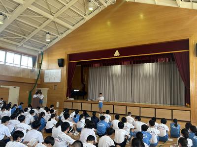 1学期終業式を暑さ対策のため、学習室から各教室へのリモート配信により行いました。校長先生からは、「充実した夏休みにしてください。」と、ありました。1学期の振り返りで、学年の代表が発表をしました。「1学期は、クラスで協力して頑張ることができました。2学期は、反省点を改善してクラスみんなで頑張りいたいです。」と、発表しました。