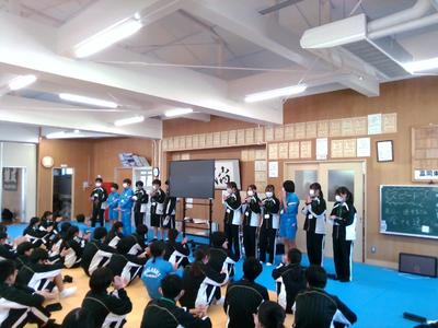 県大会に出場する、柔道部、剣道部、陸上部、ソフトテニス部、新体操部、ハンドボール部と、コンクールに出場する吹奏楽部が大会やコンクールに向けた決意表明を行いました。吹奏楽部は、演奏している動画を各クラスで視聴しました。そして、校長先生から激励の言葉が送られました。